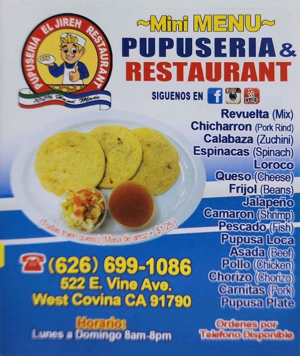 El Jireh Pupuseria Y Restaurant, nestled in the heart of West Covina, CA, is a culinary gem that masterfully blends Mexican and Salvadoran flavors. From the moment you step inside their clean, welcoming space, the friendly and professional staff make you feel right at home. Their menu offers a remarkable variety, but it's their pupusas that stand out—crispy on the outside yet soft and tender within, paired perfectly with the vibrant, crunchy curtido. Each bite tells a story of authentic, home-cooked tradition.